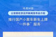 公安部10月14日在京召开新闻发布会介绍,11月1日起在全国全面推行国产小客车新车上牌一件事服务,推动车辆销售发票、购置税、保险等信息共享核查,实现国产小客车新车上牌全业务数字化办理...