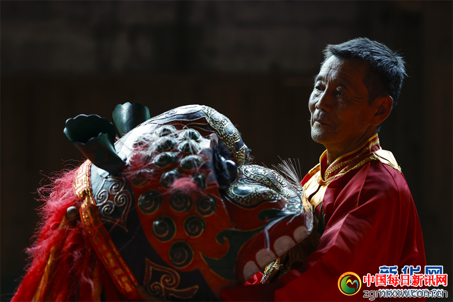 近日,安徽省黄山市歙县杞梓里镇英坑村,非遗传承人黄良立在整理狮头道具。