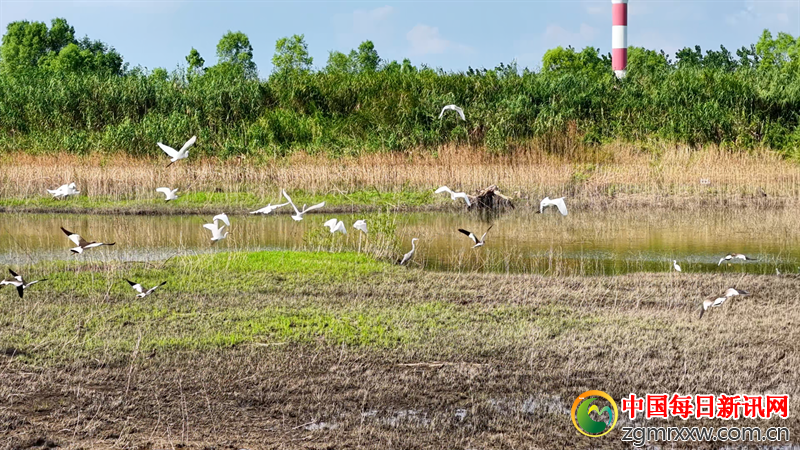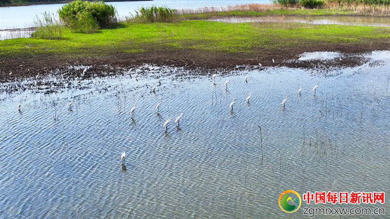蓝天白云下,成群的白鹭时而在碧波上飞翔,时而草滩上栖息