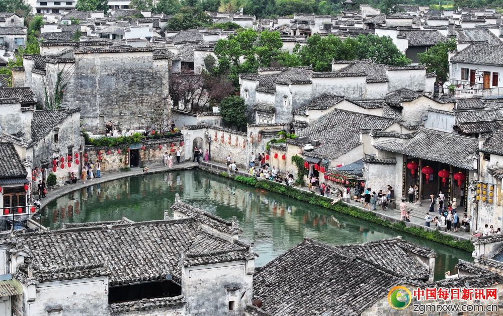 10月1日,游客在安徽省黄山市黟县宏村游玩(无人机照片)。新华社记者 杜宇 摄