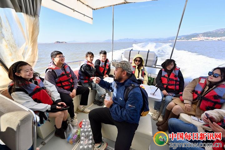 2024年11月29日,霞浦县旅游业者姜瑜带领游客乘船海上游览。