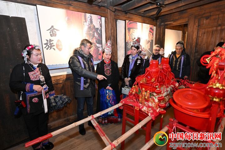 2025年1月20日,意大利客人在霞浦县半月里村参观畲族婚俗馆。