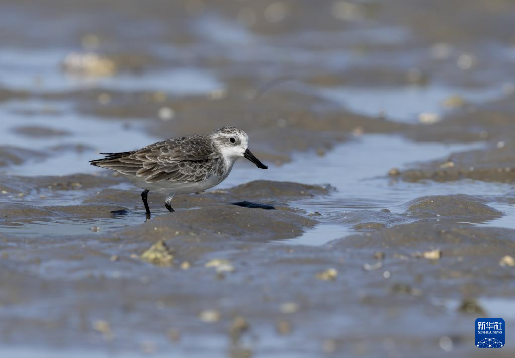 11月9日,一只勺嘴鹬在泉州围头湾滩涂上觅食。