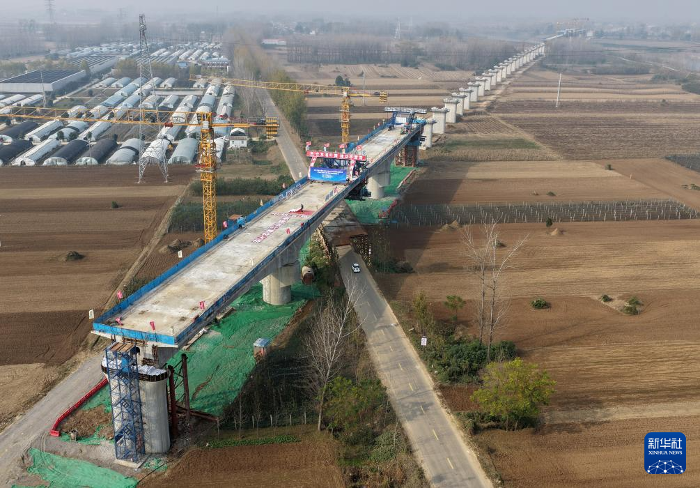 11月13日拍摄的平漯周高铁湛叶舞特大桥C段连续梁合龙施工现场(无人机照片)。