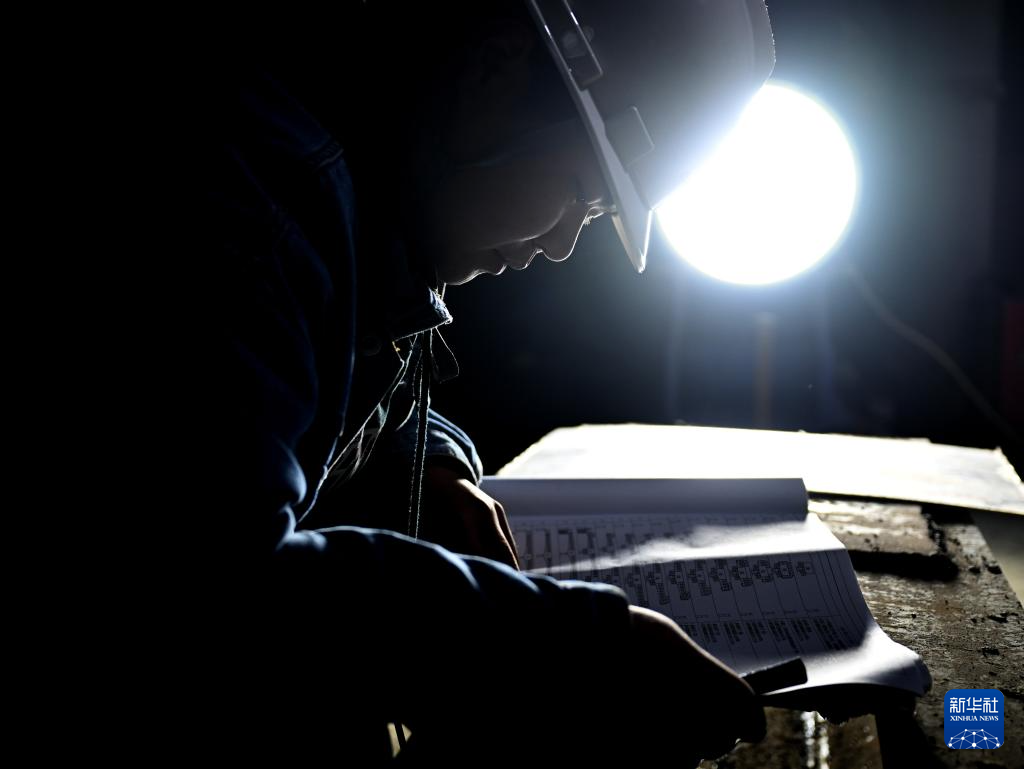 11月13日,工作人员在平漯周高铁湛叶舞特大桥C段连续梁合龙施工现场查看施工图纸。