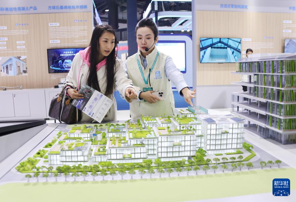 11月6日,讲解员(右)在住博会上向观众介绍展出的节能建筑。