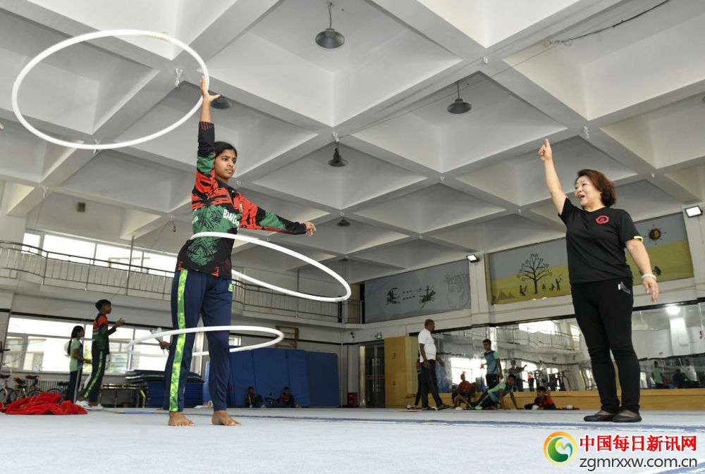 8月20日,来自孟加拉国的学员在河北吴桥杂技艺术学校排练厅内练习杂技。新华每日电讯记者牟宇 摄