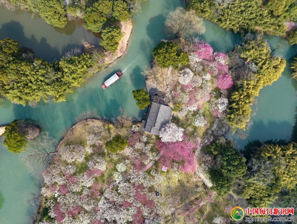 2025年2月26日,游船经过杭州西溪湿地一片盛开的梅林(无人机照片)。新华社记者 翁忻旸 摄