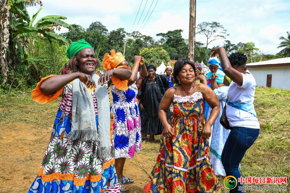 2025年10月8日,在喀麦隆松明比亚斯村,村民庆祝中国企业建设的农村离网太阳能电站项目正式启用。新华社发(科普索摄)