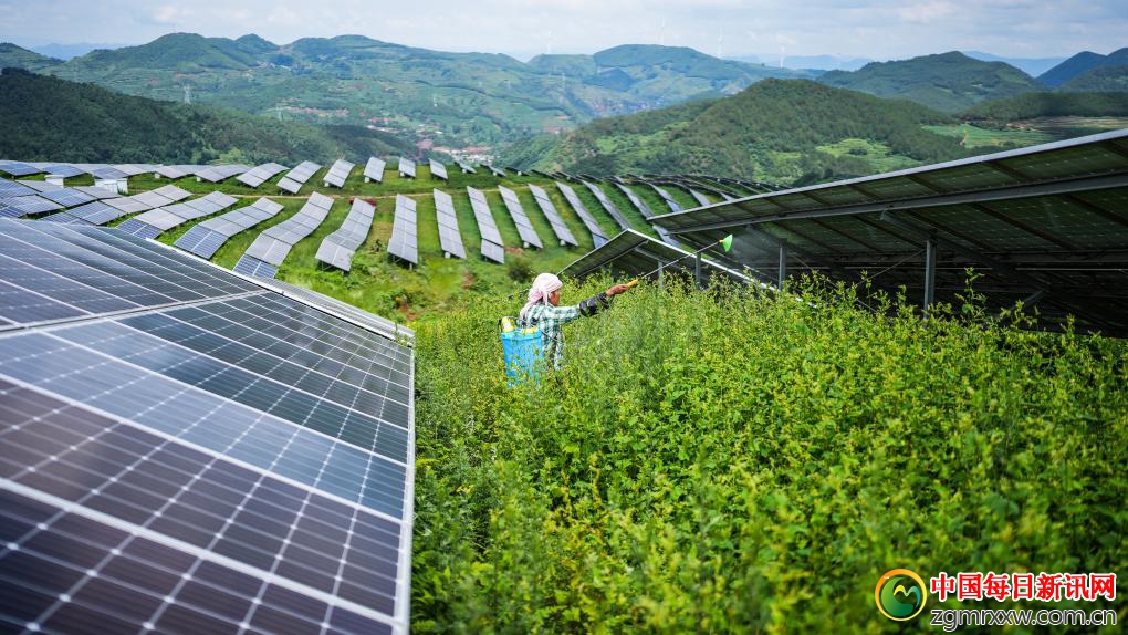 2025年7月3日,当地村民在贵州金元么站农业光伏电站光伏板间的土地上劳作。新华社记者 陶亮 摄