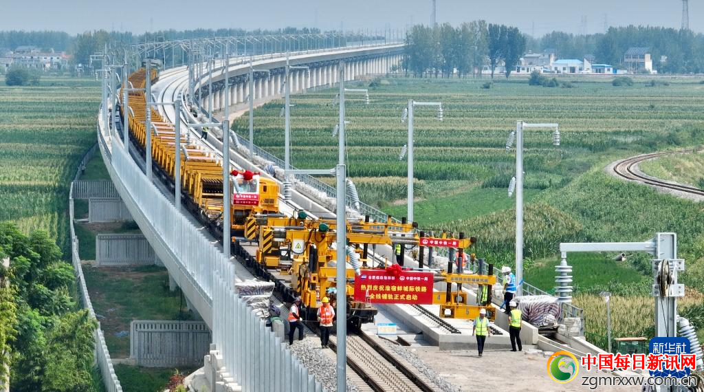 当日,在淮宿蚌城际铁路铺轨施工现场,中铁一局施工人员将首对500米长钢轨铺设在无砟轨道上,这标志着淮宿蚌城际铁路全线开始铺轨。