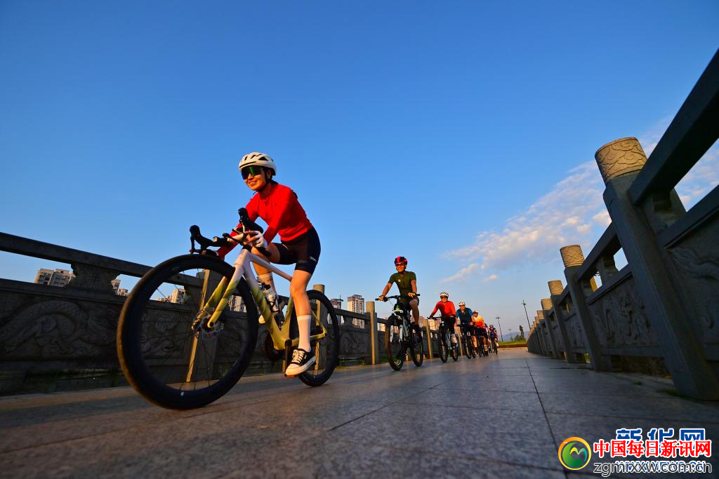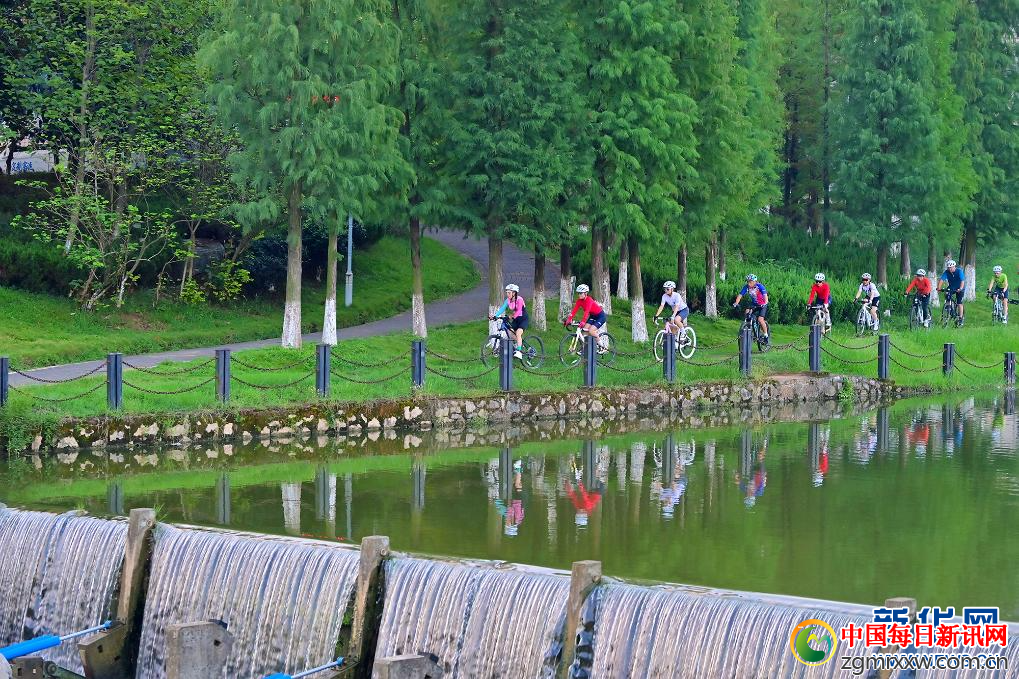 在江西省宜春市万载县龙湖公园,骑行爱好者在参加环保骑行活动。新华网发 邓龙华 摄