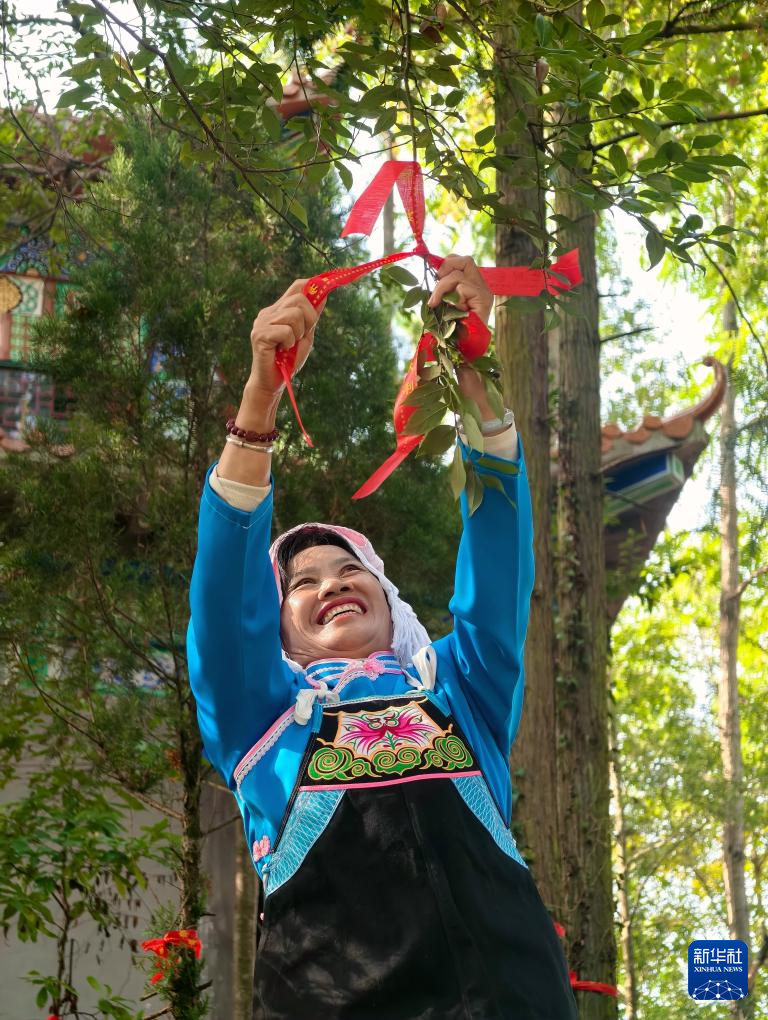 10月29日重阳节,广西南丹县群众按照传统习俗在树木上悬挂福寿带。