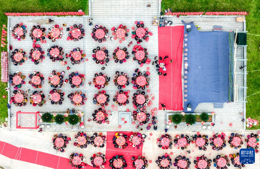 10月29日重阳节,老人们在湖北省秭归县两河口镇太坪村参加长寿宴(无人机照片)。