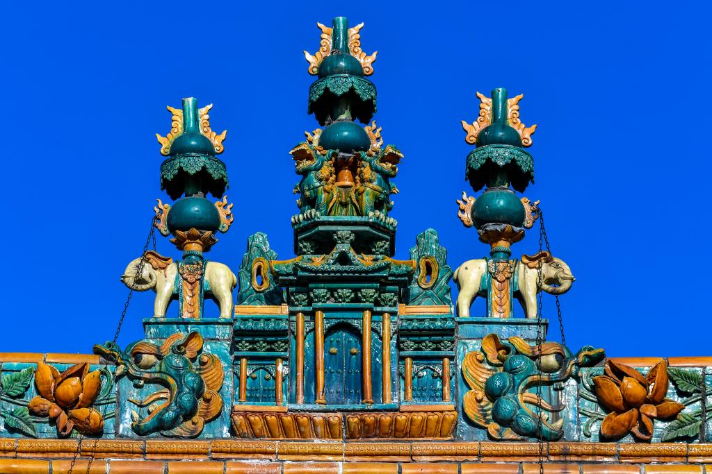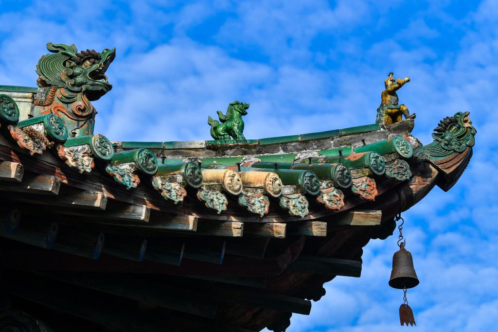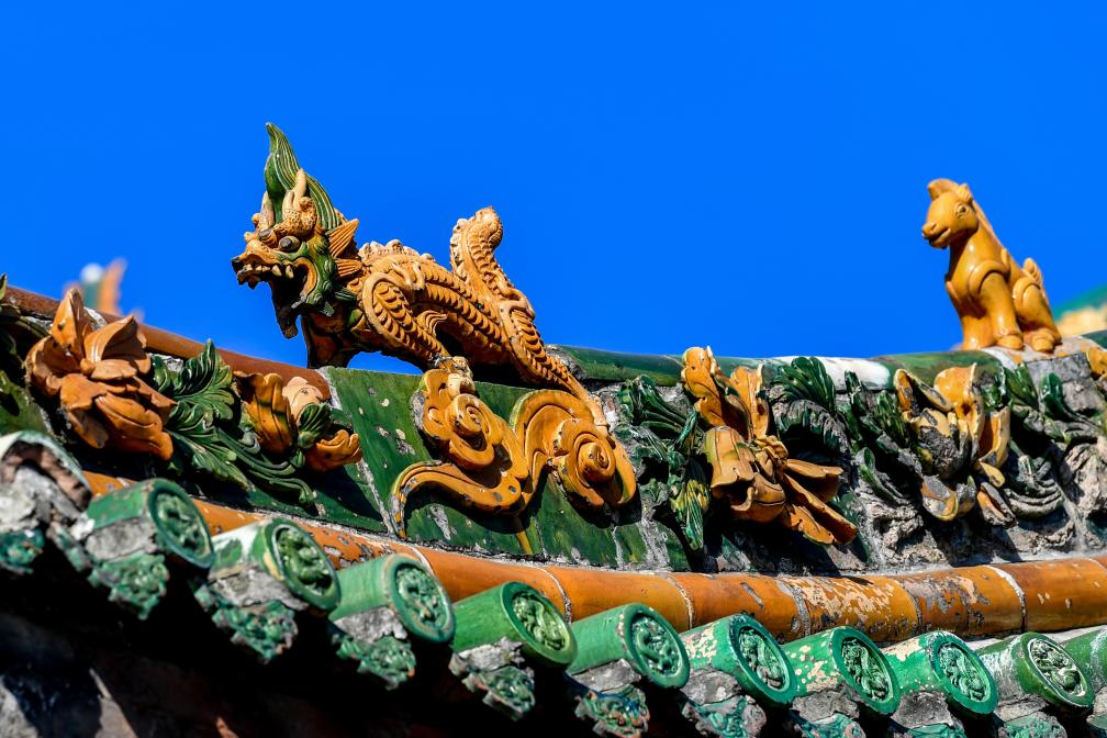 这是11月14日在山西省运城市解州关帝庙拍摄的古建顶上的装饰构件。