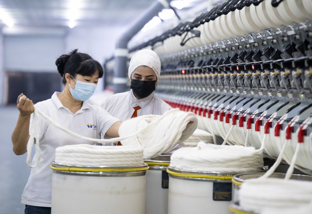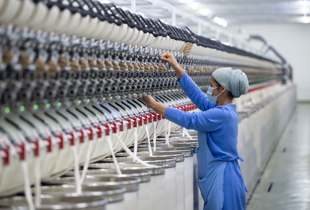 一名中方员工在中塔合作项目丹加拉农业纺织产业园的纺纱二车间工作。