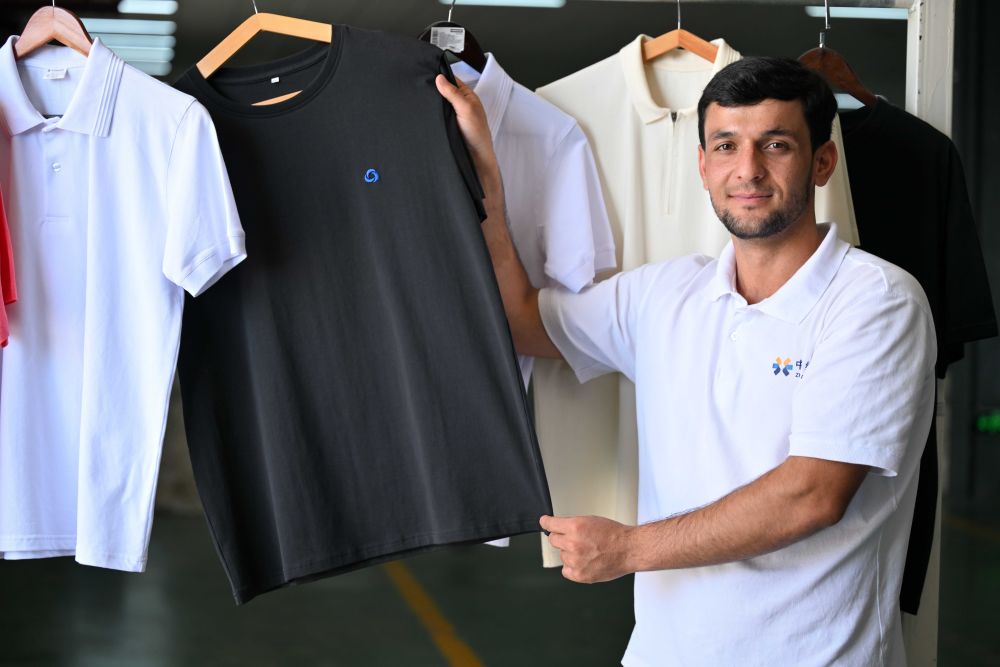 在塔吉克斯坦哈特隆州丹加拉区的中塔合作项目丹加拉农业纺织产业园,塔方员工卡尤莫夫展示成衣样品。
