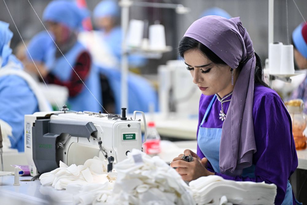 塔方员工在中塔合作项目丹加拉农业纺织产业园的成衣车间工作。