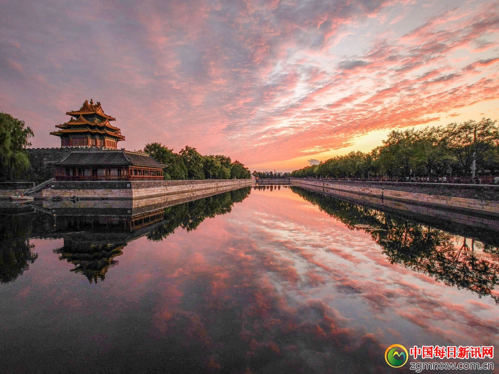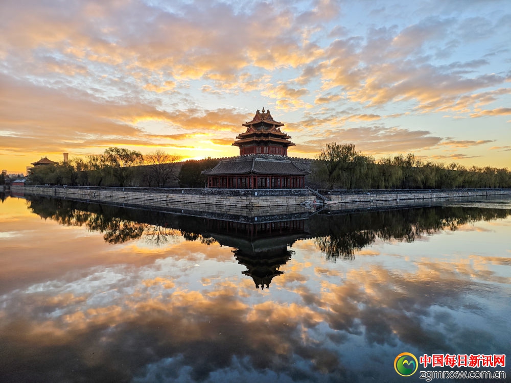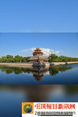 环绕故宫的护城河水面在无风的时候形成镜面反射,倒映出水面上的景象,在构图上形成上下对称的画面,如果再遇上一个好天气,则意味着能将美景放大一倍,令人赏心悦目。