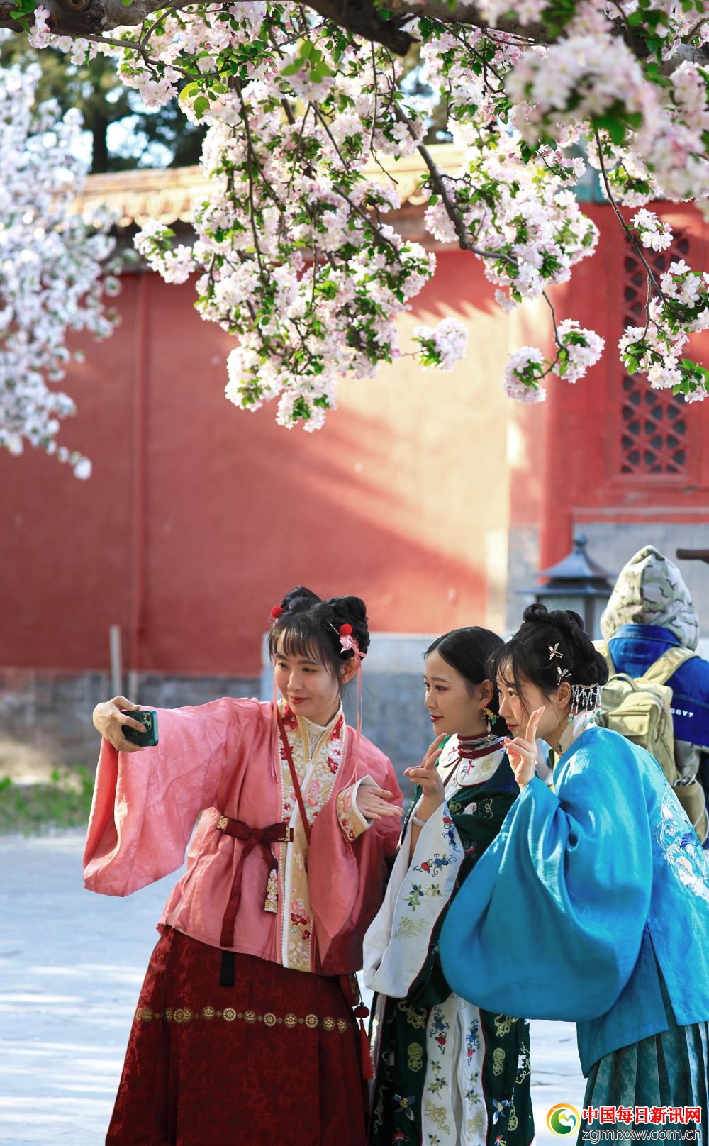 拍摄心得:文华殿的海棠是春日故宫的一大盛景,可以用照片呈现“建筑与花的对话”。拍摄时利用文华殿及配殿的朱红色墙体和绿色琉璃瓦作为背景,将一树繁花置于前景,体现出故宫的精致格调。若正好碰到身着古装的游客,便能为照片增添不少韵味。