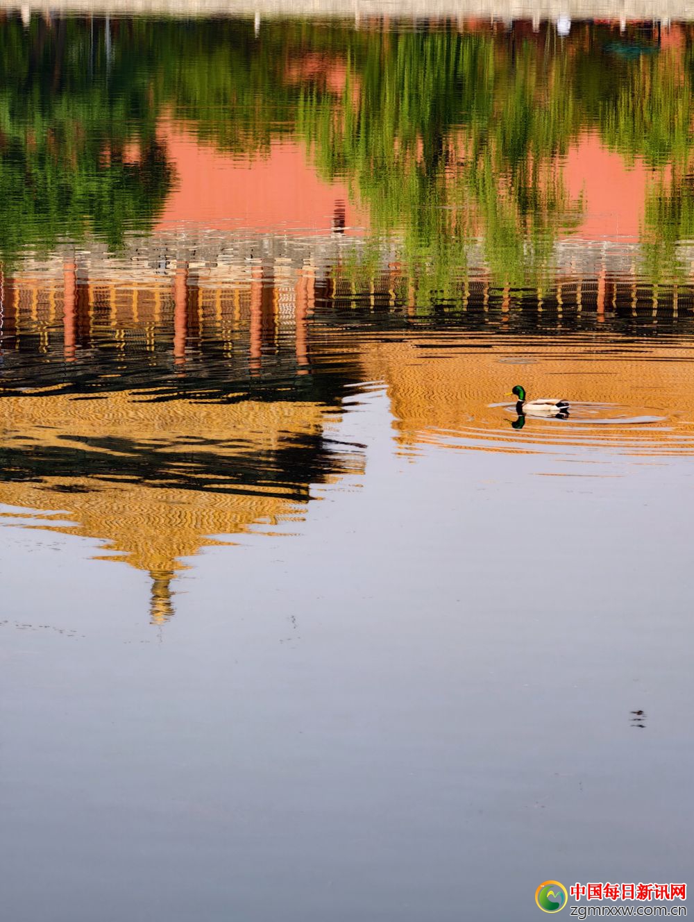 拍摄心得:水面倒影总能营造出一种独特且朦胧的写意效果。故宫外围的护城河又称筒子河,平静的水面将蓝天、橙瓦、红墙、绿树悉数映照,构成一幅色彩丰富的画面。若在此时,恰好有一只鸭子游过,涟漪轻漾,虚实交织,则更添生动。