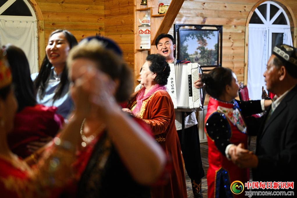 9月17日,哈萨克族客人哈加依甫·也克斯汉在餐后拉起手风琴,人们随琴声起舞。