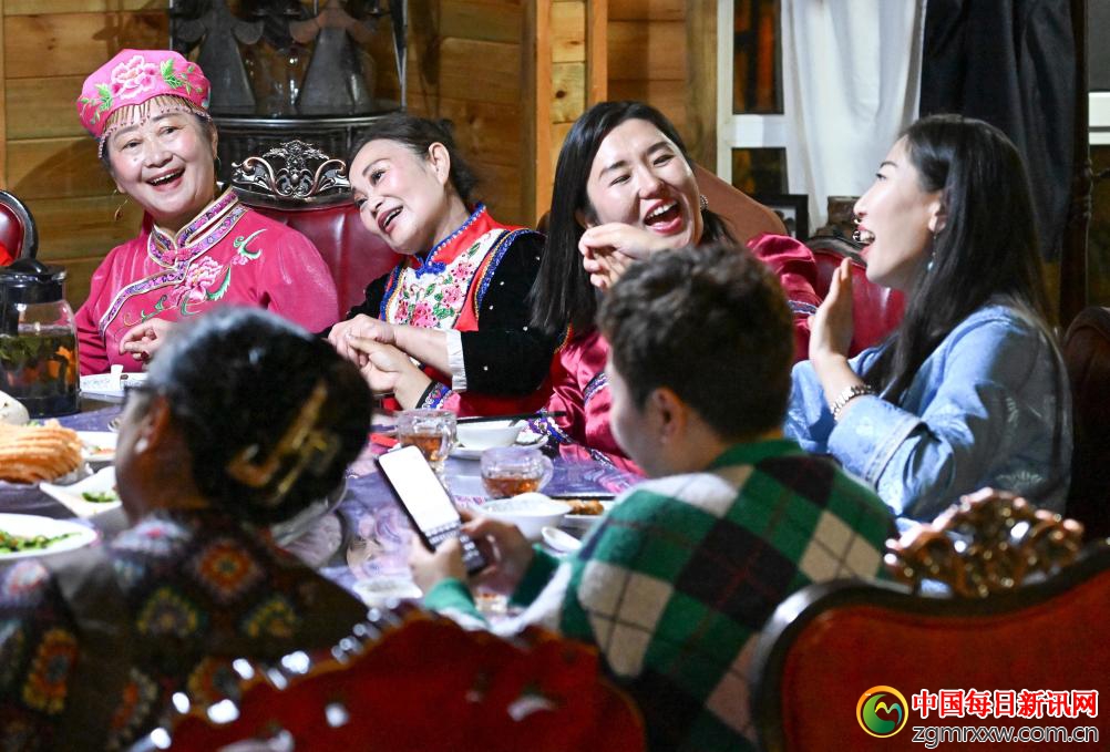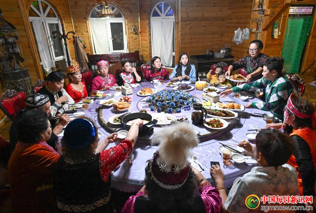 9月17日,锡伯族客人春英(左一)在席间与朋友一起歌唱。