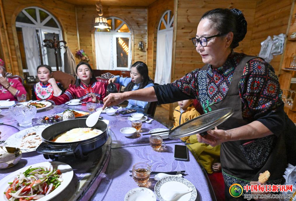 9月17日,达斡尔族客人宋瑞琪在餐后跳舞。
