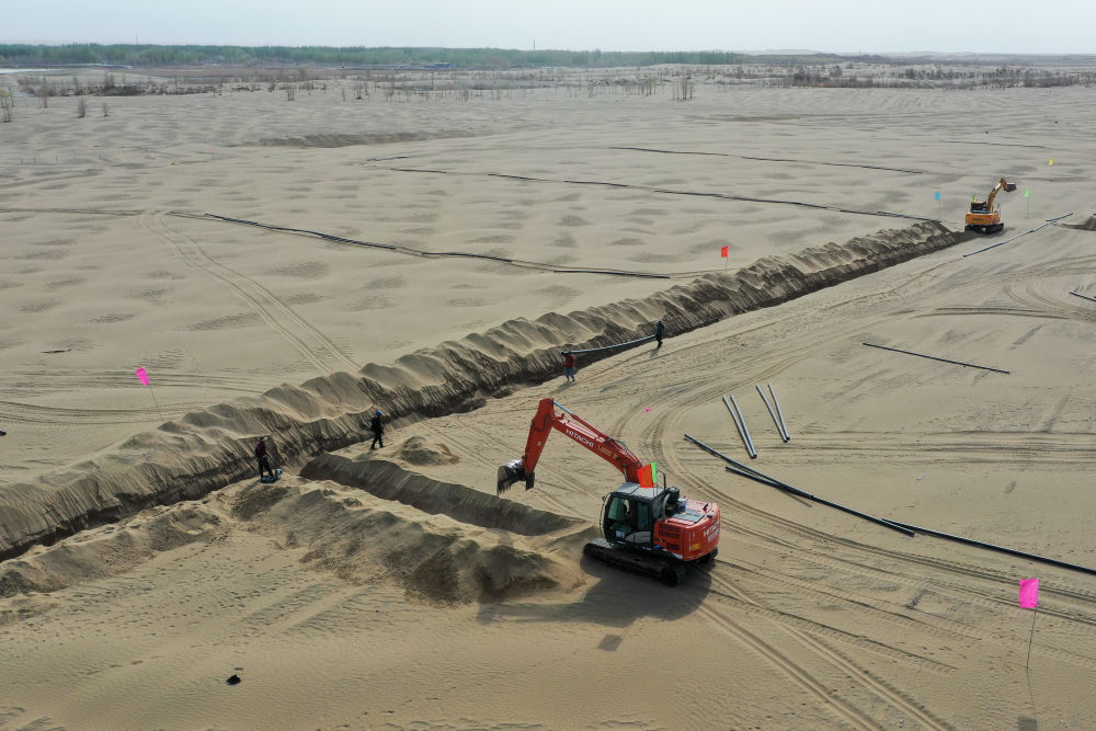 在新疆和田地区民丰县防沙治沙试验站,施工人员驾驶机械预埋输水管线(2025年4月8日摄,无人机照片)。新华社记者 丁磊 摄