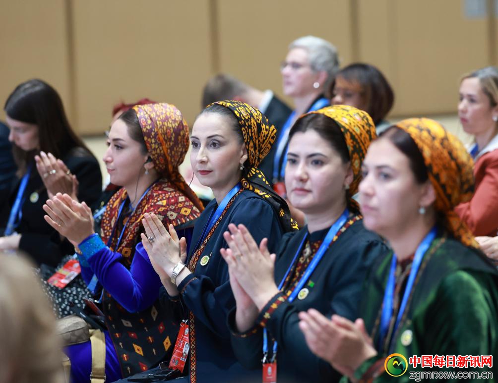 国家会议中心,不同肤色、语言和文化交融。全体会议会场外,“华韵承芳·非遗共赏”女性主题特展前,各国代表流连于精美中式作品间,感受东方文明之美;会场内,穹顶灯光如星河倾泻,精彩发言引发共情共鸣,掌声阵阵。