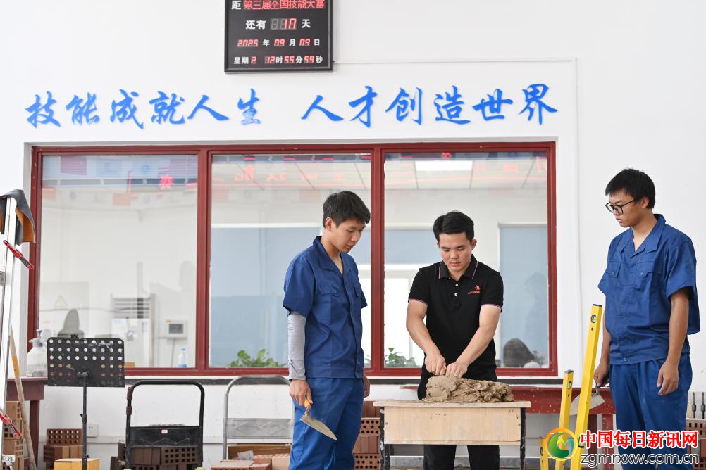 2025年9月9日,天津铁道职业技术学院砌筑集训基地,老师指导学生实践。新华社记者 李然 摄