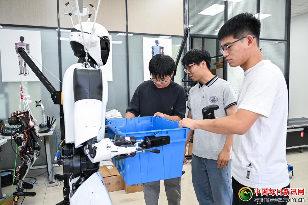 2025年5月29日,华中科技大学机械科学与工程学院,学生对“荆楚”人形机器人进行搬运测试。新华社记者 杜子璇 摄