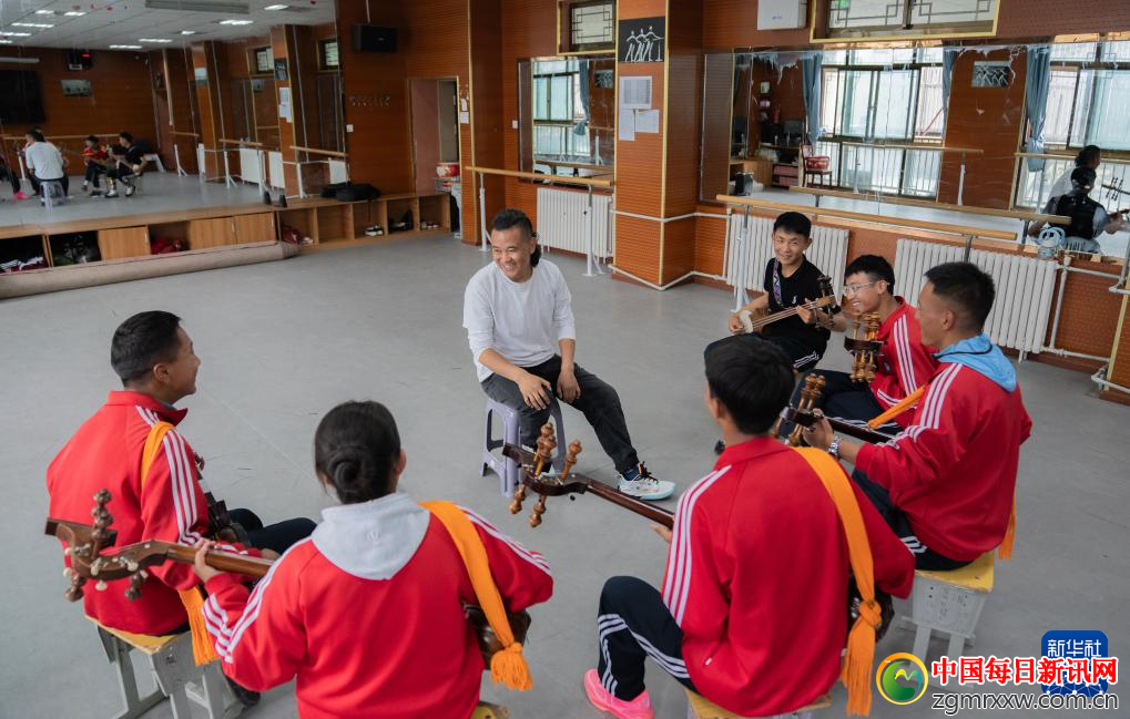 9月9日,在拉萨市第二中等职业技术学校,洛桑次仁老师在给孩子们传授扎念琴弹奏的要领。新华社记者 丁增尼达 “扎念”在藏语中意为“悦耳之声”。扎念琴俗称“六弦琴”,它历史悠久,在西藏古代壁画与文献中均有记载。它扎根于藏族群众生活,是节日、庆典与劳作之余不可或缺的伴侣。它常伴史诗、传说与故事的吟唱,是藏族群众引以为傲的文化技艺。