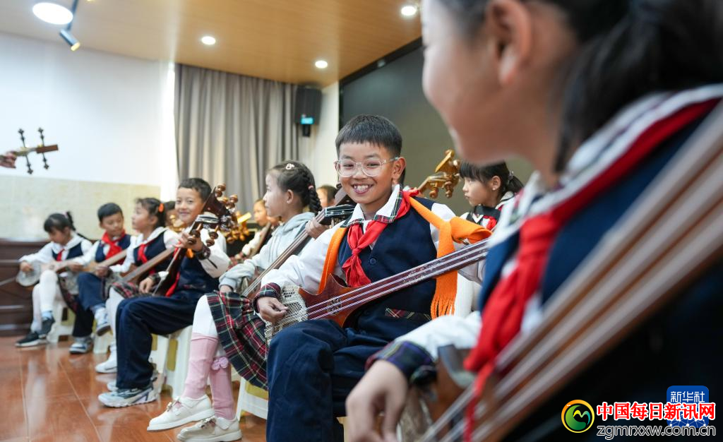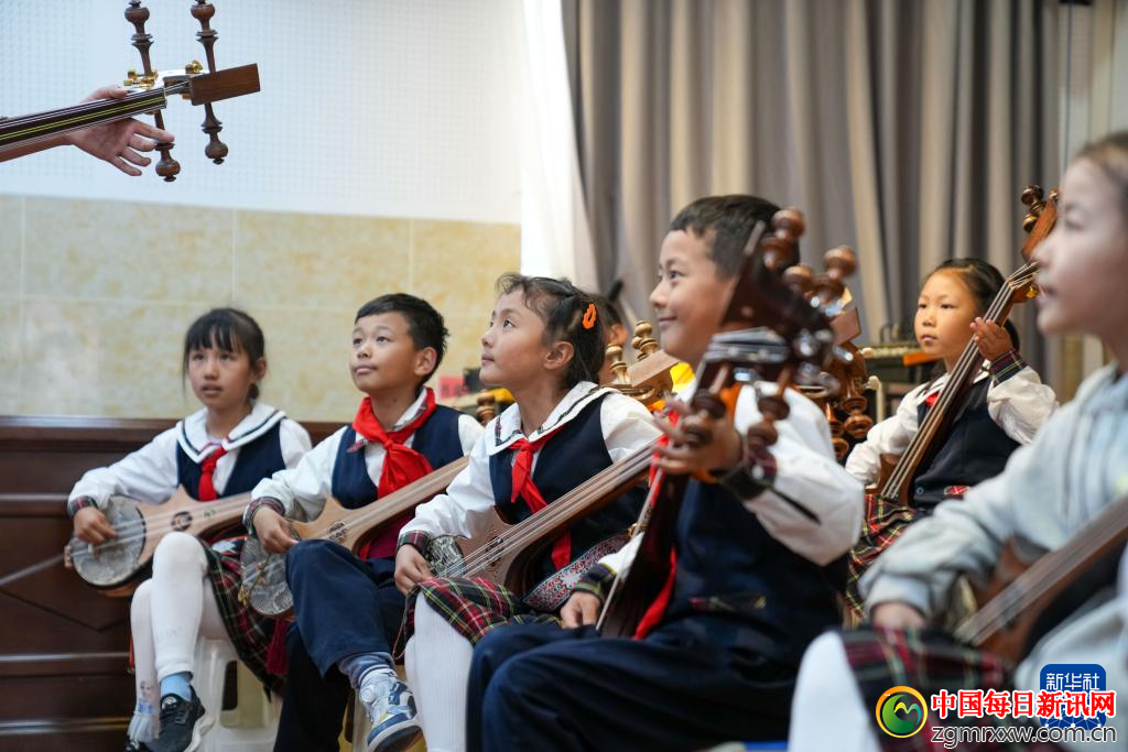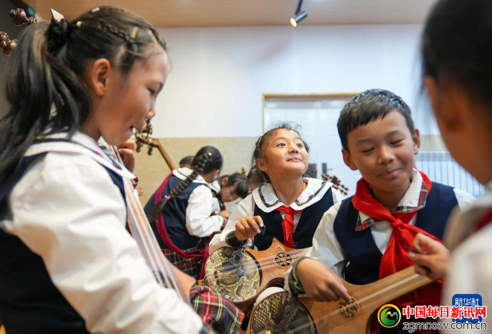 9月11日,在拉萨市实验小学,孩子们在弹奏扎念琴。新华社记者 晋美多吉 摄