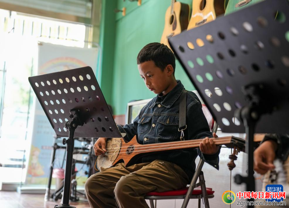 9月13日,在拉萨市古乐扎念琴行,孩子们在弹奏扎念琴。新华社记者 晋美多吉 摄