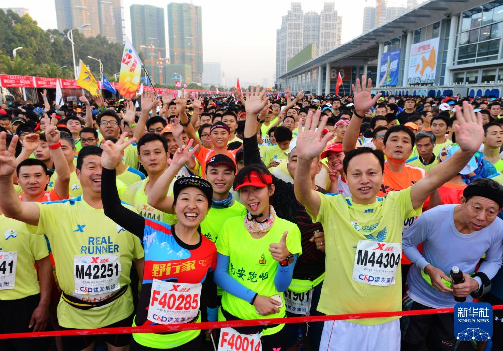 2016年1月2日,参赛选手在厦门国际马拉松赛开始前欢呼。新华社记者魏培全摄