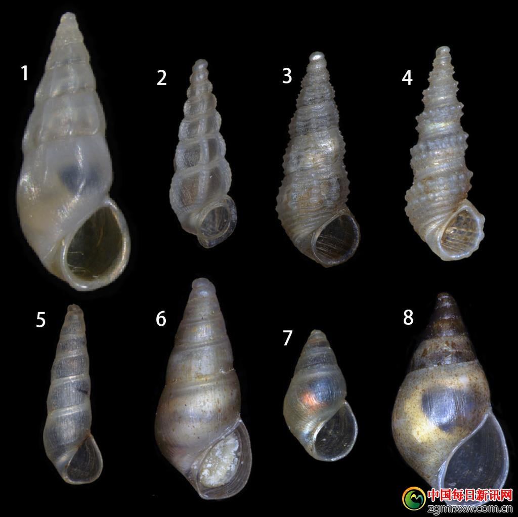 1-8分别是玻璃昆明螺、铁锏昆明螺、流萤昆明螺、珍珠昆明螺、银匙远岸螺、大池远岸螺、冰糯远岸螺、俞元远岸螺。中国科学院昆明动物研究所供图