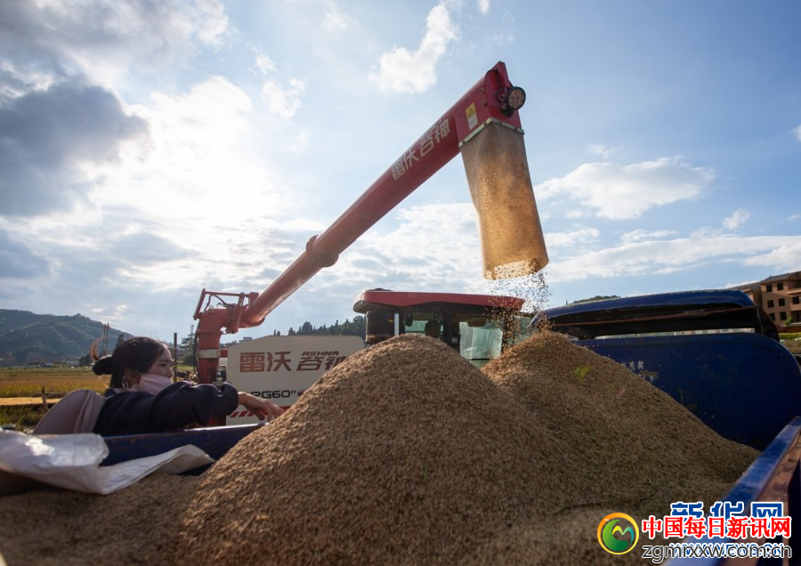 云南省曲靖市沾益区大坡乡威格村的村民正在收割水稻(10月10日摄)。新华网发(杨俊鹏 摄)