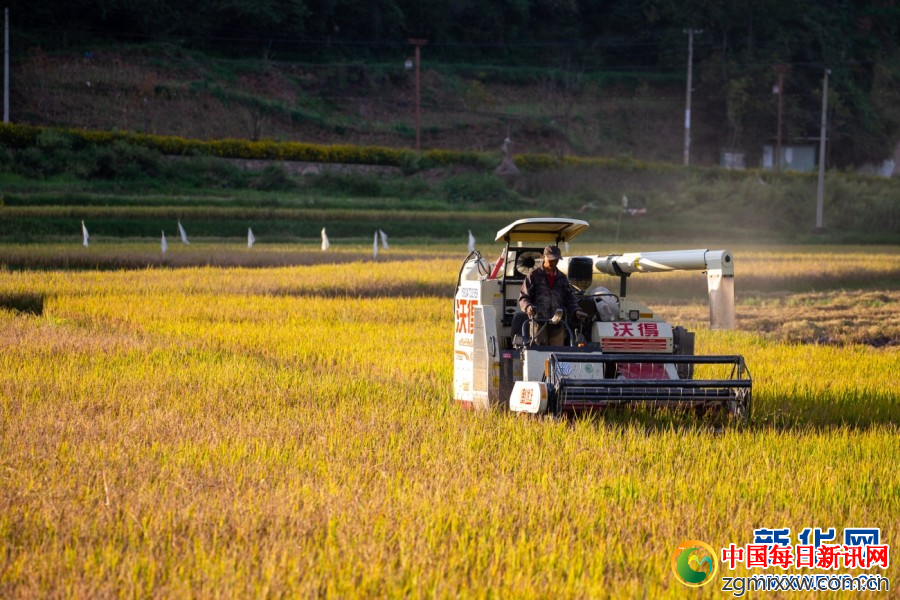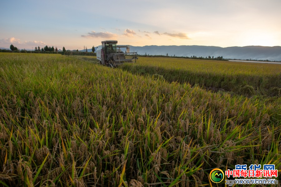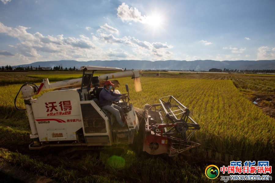 云南省曲靖市麒麟区越州镇舟上村的村民正在收割水稻(10月12日摄)。新华网发(杨俊鹏 摄)