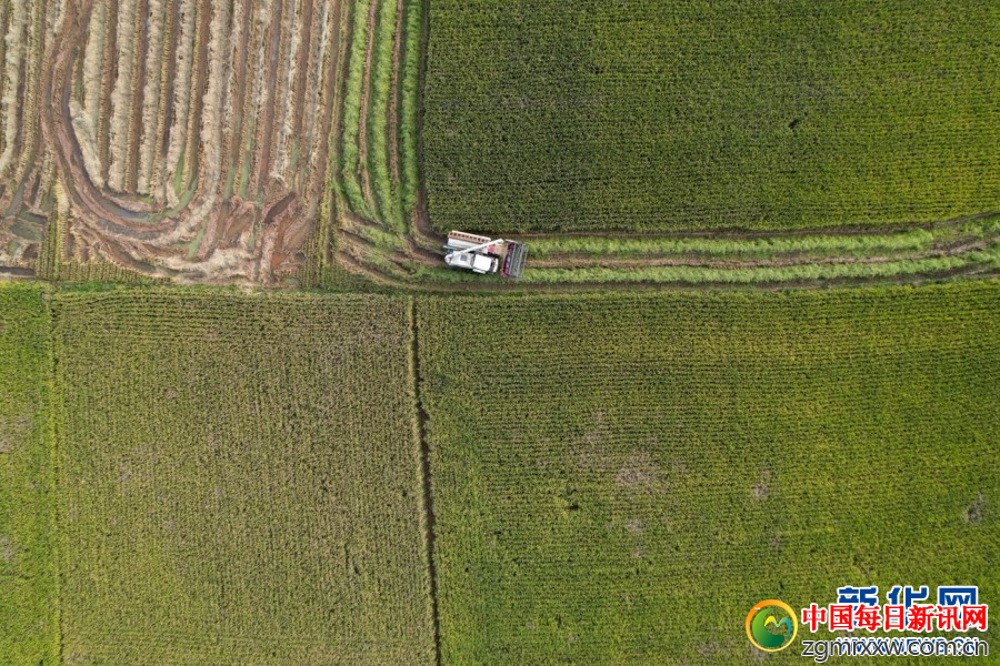 航拍云南省曲靖市麒麟区越州镇舟上村收割水稻(10月12日摄)。新华网发(杨俊鹏 摄)