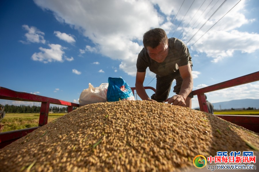 云南省曲靖市麒麟区越州镇舟上村,村民丰收笑开颜(10月12日摄)。新华网发(杨俊鹏 摄)