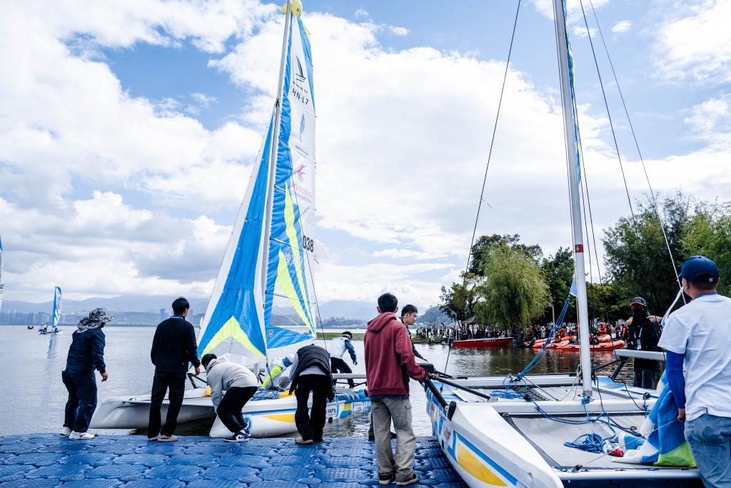 10月25日,中国万水千帆赛大理站在云南省大理白族自治州开赛,图为参赛船只从出发点下水。新华社记者 胡超 摄