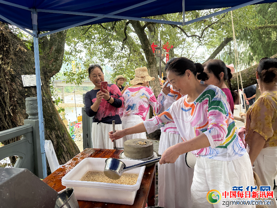 衢州市开化县马金镇石柱村举办“迎国庆”豆腐家宴美食品鉴会,游客与村民欢聚一堂,共同感受乡村美食的独特魅力。此外,石柱村还准备了“Jue青蛳”挑战赛、高跷竹马、狮象灯舞、皮划艇等水上游乐项目等丰富多彩的配套活动。新华网发 开化传媒集团供图