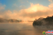 深秋时节,安徽省池州市石台县秋浦河晨雾氤氲,如轻纱缭绕。天边霞光渐染云层,与朦胧晨雾交融辉映,宛若一幅天然绘就的水墨长卷。(王帆 徐丽红)