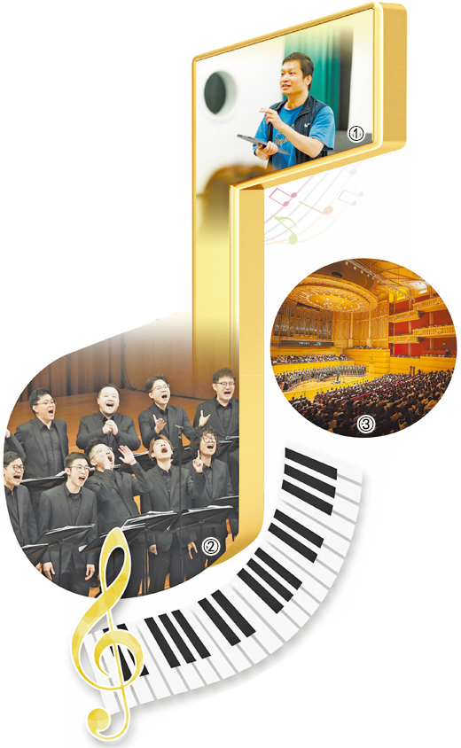图①:广西南宁越人合唱团艺术总监蓝壮青为合唱团成员指导发声方法。  兰 谦摄(人民视觉)  图②:正在进行合唱表演的上海彩虹室内合唱团。  上海彩虹室内合唱团供图  图③...